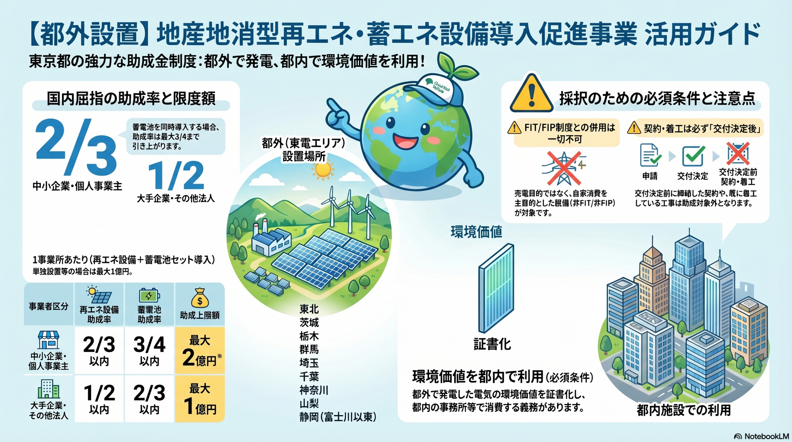 本文書は、東京都および公益財団法人東京都環境公社(クール・ネット東京)が実施する「地産地消型再エネ・蓄エネ設備導入促進事業(都外設置)」の概要と主要な要件をまとめたものである。